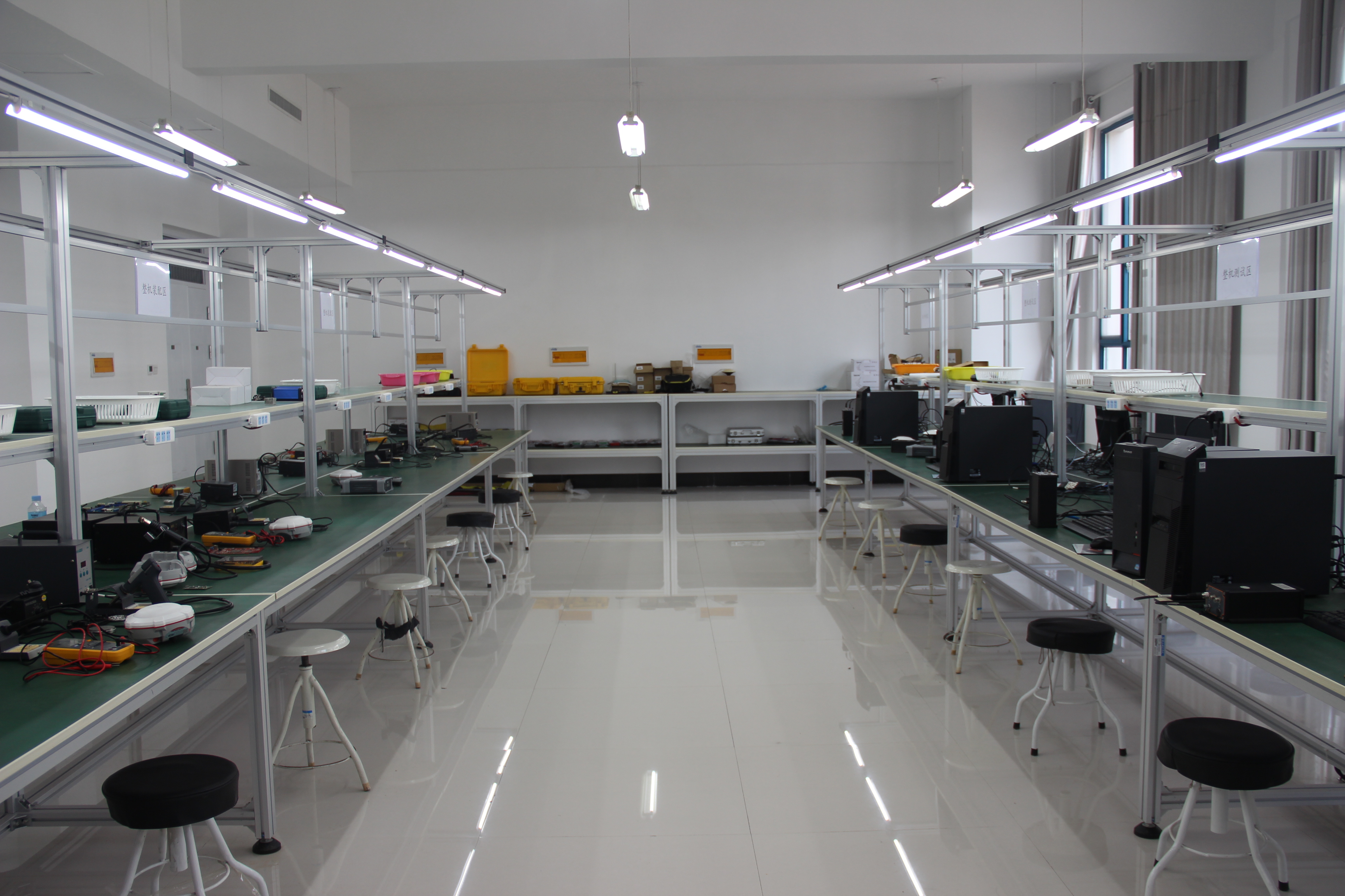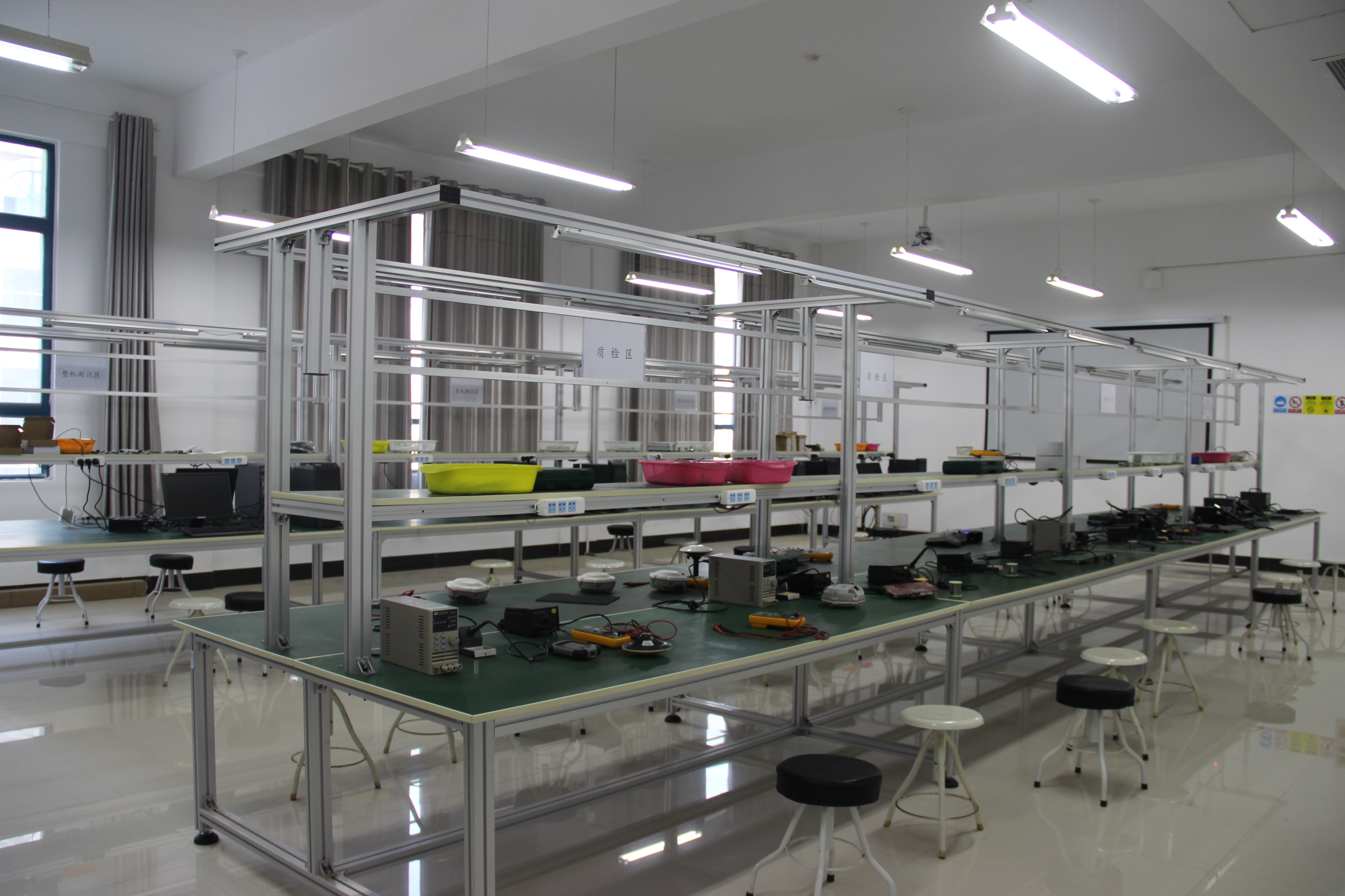 本實訓室側(cè)重于北斗衛(wèi)星接收機的芯片測試、主板焊接、整機組裝、整機測試等工作。實訓室面積120余平方米,設(shè)備價值120余萬元,具有板卡信號測試、組裝、焊接、總裝等工藝流程,具有24個生產(chǎn)工位。