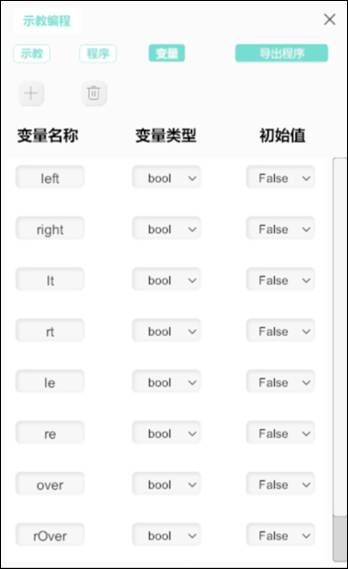 (3)變量頁(yè)面:機(jī)器人的變量面板,可對(duì)程序中的變量進(jìn)行添加與修改。點(diǎn)擊“+”可對(duì)變量進(jìn)行添加,點(diǎn)擊“刪除”可對(duì)選中變量進(jìn)行刪除。變量類(lèi)型有int(整數(shù)類(lèi)型)、float(浮點(diǎn)數(shù)類(lèi)型)、bool(布爾類(lèi)型)、string(字符串類(lèi)型)四種類(lèi)型。同時(shí)可對(duì)變量名稱(chēng)進(jìn)行編輯,對(duì)變量類(lèi)型進(jìn)行選擇,對(duì)初始值進(jìn)行手動(dòng)輸入。