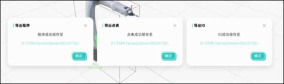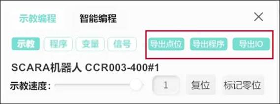 示教面板上方“導(dǎo)出點(diǎn)位”、“導(dǎo)出程序”“導(dǎo)出I0”按鈕,分別支持對(duì)當(dāng)前點(diǎn)位表、程序、10的導(dǎo)出。