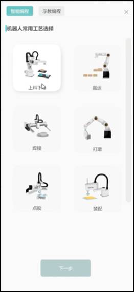 (1)上料下料:加工工件通常需要經(jīng)過(guò)多道加工工序,將原料從上料/下料機(jī)構(gòu)轉(zhuǎn)移到上料/下料點(diǎn),保證加工工件在整個(gè)系統(tǒng)中的自然有序流轉(zhuǎn),是生產(chǎn)線(xiàn)中最常見(jiàn)的加工工序。智能編程時(shí)需要對(duì)上料/下料工件、上料/下料的起始點(diǎn)、上料/下料的終點(diǎn)進(jìn)行設(shè)置;