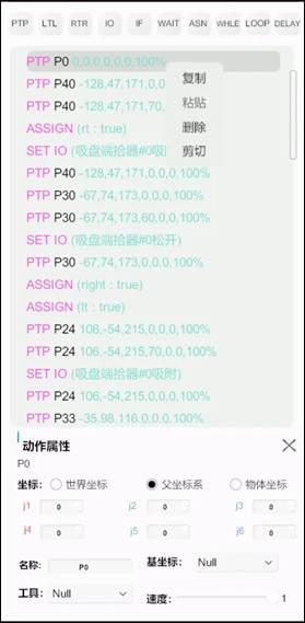 (2)程序頁(yè)面:機(jī)器人的程序面板包含:子程序列表、機(jī)器人的快捷指令,程序編輯面板以及相應(yīng)的動(dòng)作屬性。子程序?yàn)橛脩?hù)提供了一種整理程序的方式,可進(jìn)行創(chuàng)建、復(fù)制和刪除的操作,同時(shí)“CALL”語(yǔ)句可以實(shí)現(xiàn)對(duì)子程序的調(diào)用。在程序編輯面板中可對(duì)指令進(jìn)行增刪改查操作,如下圖所示可進(jìn)行程序的復(fù)制、粘貼、刪除、剪切操作,可通過(guò)按住某一行程序進(jìn)行上下移的,來(lái)完成對(duì)程序面板上的程序進(jìn)行調(diào)整順序的操作。