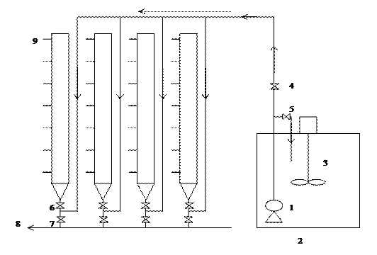 1、水泵 2、配水箱 3、攪拌裝置 4、配水管閥門 5、水泵循環(huán)管閥門 6、各沉淀柱進水閥門 7、各沉淀柱放空閥門 8、排水管 9、取樣口