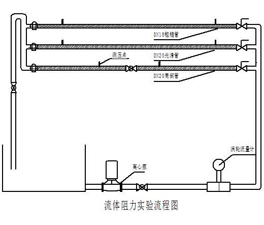 流體在流動(dòng)過程中要消耗能量以克服流動(dòng)阻力。因此,流動(dòng)阻力的測定頗為重要。從流程圖可知水從貯槽由泵輸出,經(jīng)流量計(jì)計(jì)量后,再流經(jīng)管道后回到水槽,循環(huán)利用。改變流量并測定直管與管件的相應(yīng)壓差,即可測得流體流動(dòng)阻力。