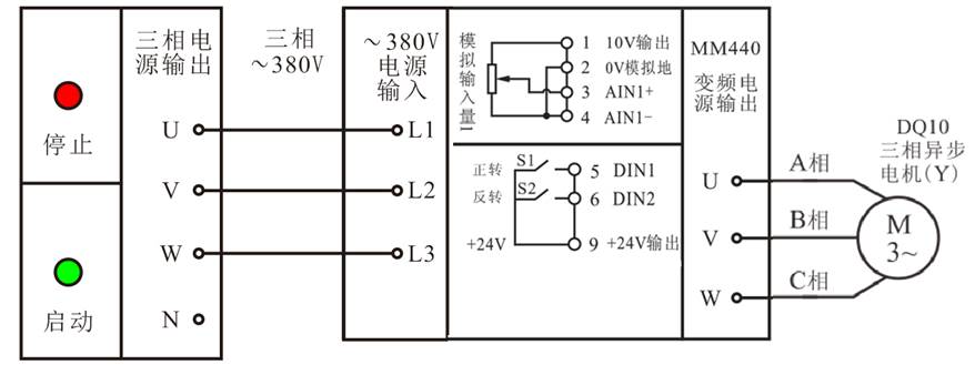 用開關(guān)S1,S2控制實(shí)現(xiàn)電動機(jī)起停工能,由模擬輸入端控制電動機(jī)轉(zhuǎn)速的大小。