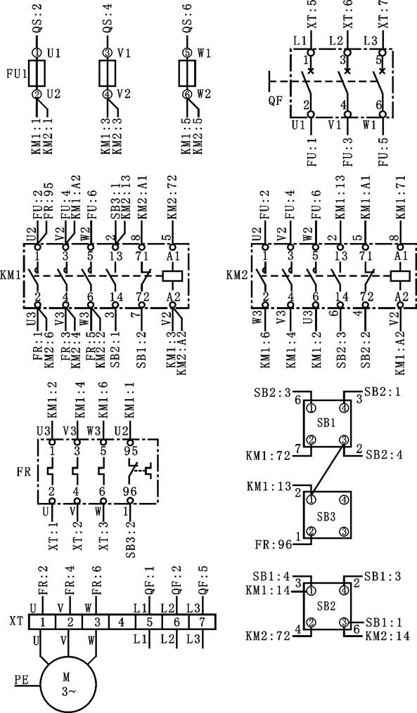 按布置圖器件的位置,在WD-21、WD-22掛板上選擇QF、FU、KM1、KM2、FR、SB1、SB3、SB2、XT等器件。圖5C(b)為用中斷線表示的單元接線圖,每個(gè)器件端子處接的線號(hào)及端子之間的連線圖上已明確示出。對(duì)接線和查線帶來很大方便。安裝與接線后,應(yīng)符合第二章的要求。
