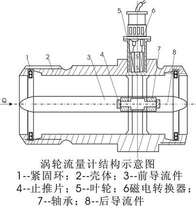流量計主要由殼體、導(dǎo)流器、支承、渦輪和磁電轉(zhuǎn)換器組成,渦輪是測量元件,它由導(dǎo)磁系數(shù)較高的不銹鋼材料制成,軸芯上裝有數(shù)片呈螺旋形或直形的葉片,流體作用于葉片,使渦輪轉(zhuǎn)動。殼體和前后導(dǎo)流件由非導(dǎo)磁的不銹鋼材料制成,導(dǎo)流件對流體起導(dǎo)直作用。在導(dǎo)流件上裝有滾動軸承或滑動軸承,用來支撐轉(zhuǎn)動的渦輪。將渦輪轉(zhuǎn)速轉(zhuǎn)換為電信號的方法以磁電式轉(zhuǎn)換法應(yīng)用最廣泛。磁電感應(yīng)信號檢測器包括磁電轉(zhuǎn)換器和前置放大器,磁電轉(zhuǎn)換器由線圈和磁鋼組成,用于產(chǎn)生與葉片轉(zhuǎn)速成比例的電信號,前置放大器放大微弱電信號,使之便于遠(yuǎn)傳。