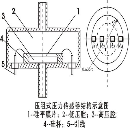 硅平膜片上的擴(kuò)散電阻通常構(gòu)成橋式測量電路,相對的橋臂電阻是對稱布置的,電阻變化時,電橋輸出電壓與膜片所受壓力成對應(yīng)關(guān)系。上圖所示為一種壓阻式壓力傳感器的結(jié)構(gòu)示意圖,硅平膜片在圓形硅杯的底部,硅杯的內(nèi)外兩側(cè)輸入被測壓力及參考壓力,本套裝置的傳感器參考壓力為當(dāng)?shù)卮髿鈮毫Α毫Σ钍鼓て冃,膜片上的兩對電阻阻值發(fā)生變化,使電橋輸出相應(yīng)壓力變化的信號。為了補(bǔ)償溫度效應(yīng)的影響,一般還可在膜片上沿對壓力不敏感的晶向生成一個電阻,這個電阻只感受溫度變化,可接入橋路作為溫度補(bǔ)償電阻,以提高測量精度。