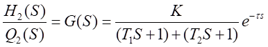 根據(jù)物料動(dòng)態(tài)平衡關(guān)系,并考慮到液體傳輸過程中的時(shí)延,其傳遞函數(shù)為: