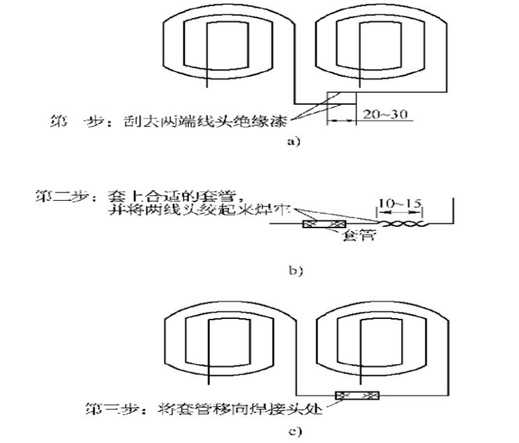 一般焊接時,先將兩根待焊的導線留以適當?shù)拈L度,并將導線線頭絕緣漆刮去,長度約15—30mm,然后將兩根導線緊緊地絞在一起用錫焊牢。錫焊部分長度不少于l0mm。焊口用20一30mm的蠟套管或聚氯乙烯套管套好。具體操作分為了步,如下圖所示。