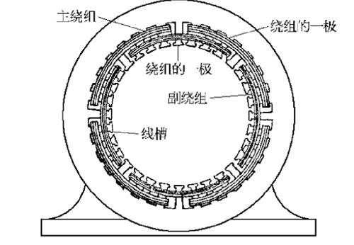 定子結(jié)構有兩種形式。較大功率的采用和三相異步電動機相似的結(jié)構,定子鐵心也是用硅鋼片沖壓而成。鐵心槽內(nèi)放置有兩套繞組,一套是主繞組,也稱工作繞組,另一套是副繞組。俗稱起動繞組(內(nèi)總槽的1/3)。兩種繞組一般采用同心式繞組,其軸線在空間相隔90度電角度。功率較小的定子鐵心制成凸極形狀,磁極的一部分被短路環(huán)罩住,凸極上裝有主繞組,一般為集中式繞組。