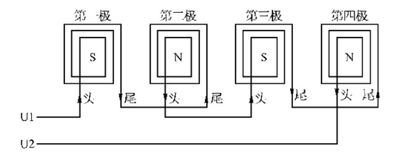 (2)不管電動機的極數(shù)有多少,同一繞組相鄰兩磁極的極性必須是相反的。所以兩相鄰線圈組的接法是,在串聯(lián)接線時應當是“反串聯(lián)”,即“頭—頭”連接或“尾—尾”連接。