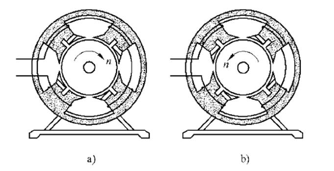 罩極電動機的轉(zhuǎn)向,是從主繞組軸線轉(zhuǎn)向罩極繞組軸線的,如果要改變普通罩極電動機的旋轉(zhuǎn)方向.就只要將電動機拆開,把定子或轉(zhuǎn)子反向安裝.如圖下a所示,是沿順時針方向旋轉(zhuǎn)的電動機。而圖b只是將定子鐵心反向安裝,則電動機沿逆時針方向旋轉(zhuǎn)。