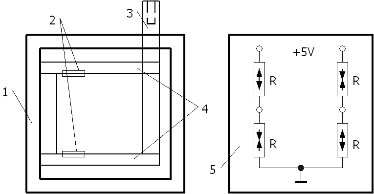 1─外殼  2─電阻應(yīng)變片  3─測(cè)桿  4─等截面懸臂梁  5─面板接線圖