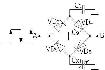 2、圖7-1中的電容轉(zhuǎn)換電路圖如圖7-2所示。圖中的信號(hào)發(fā)生器用于產(chǎn)生方波信號(hào)。電容轉(zhuǎn)換由二極管環(huán)形電橋完成,二極管環(huán)電橋工作原理如圖7-3所示。
