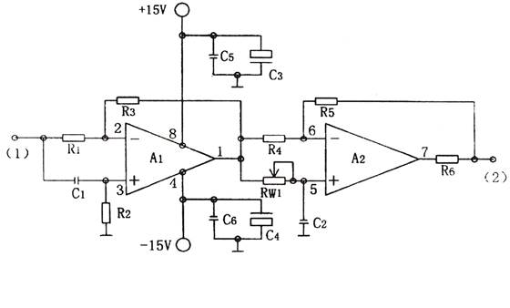 A1與C1、R2組成有源微分網(wǎng)絡(luò),A2與RW1、C2組成有源積分網(wǎng)絡(luò),當(dāng)①端輸入天弦交流信號(hào)μm時(shí),A1輸出一超前μm相位信號(hào),A2輸出一滯后μm相位的信號(hào),通過(guò)調(diào)節(jié)RW1可使輸出信號(hào)與輸入信號(hào)相位發(fā)生變化。