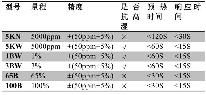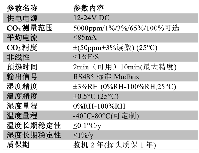 表2-2 二氧化碳傳感器探頭參數(shù)與選型