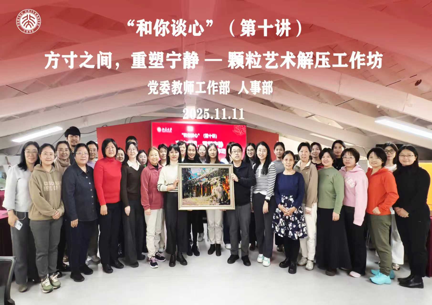 為進一步幫助教職工疏解壓力、調(diào)節(jié)情緒,以更加飽滿的狀態(tài)投入工作與生活,黨委教師工作部、人事部于2025年11月11日舉辦“和你談心”系列活動第十期——“顆粒藝術解壓工作坊”,40余位教職工參加。