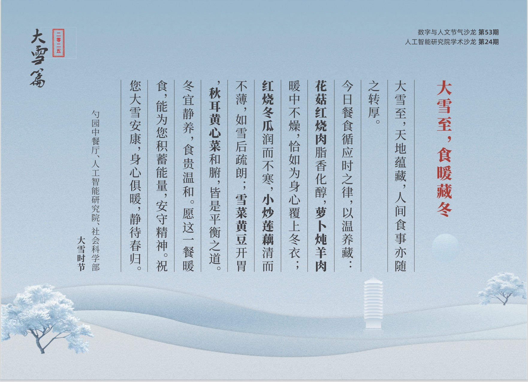本次活動中,社會科學部繼續(xù)與勺園中餐廳合作,推出大雪節(jié)氣特色美食,為與會師生提供了良好的交流環(huán)境。玻爾知識庫繼續(xù)為沙龍活動提供專屬知識庫,方便不同專業(yè)背景的觀眾了解主題內(nèi)容。