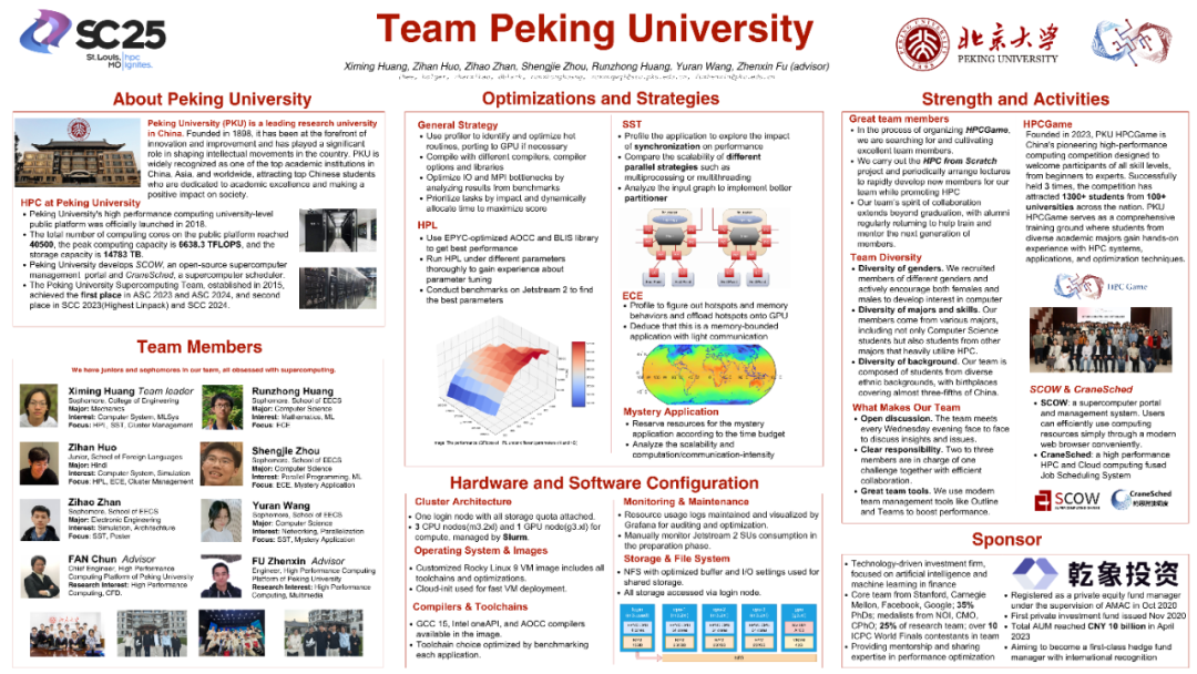 11月18日至20日,2025年SCC國(guó)際大學(xué)生超算競(jìng)賽舉行。北京大學(xué)超算隊(duì)在來(lái)自全球多所頂尖高校的激烈競(jìng)爭(zhēng)中脫穎而出,最終榮獲線上賽道總分第二名,并在LINPACK基準(zhǔn)性能測(cè)試中奪得第一名,充分展現(xiàn)了北京大學(xué)在高性能計(jì)算領(lǐng)域的扎實(shí)功底與創(chuàng)新能力,也是學(xué)校推進(jìn)科技創(chuàng)新人才培養(yǎng)的生動(dòng)實(shí)踐。