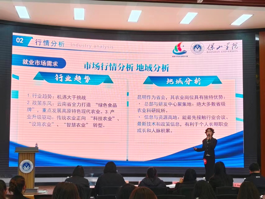 比賽現(xiàn)場(chǎng),選手們通過(guò)行業(yè)趨勢(shì)研判、地域發(fā)展分析、個(gè)人成長(zhǎng)路徑設(shè)計(jì)等多個(gè)環(huán)節(jié),全面呈現(xiàn)了個(gè)人對(duì)未來(lái)職業(yè)的深入思考與系統(tǒng)規(guī)劃。經(jīng)濟(jì)管理學(xué)院劉悅以“扎根云嶺聲動(dòng)四方”為題,勾勒出滇西青年的文化遠(yuǎn)征職業(yè)藍(lán)圖,立志將地方特色文化傳播遠(yuǎn)方;馬惟萌聚焦鄉(xiāng)村教育發(fā)展,以“扎根鄉(xiāng)土,編織未來(lái)”為目標(biāo),立志成為鄉(xiāng)村兒童計(jì)算思維啟蒙導(dǎo)師,用知識(shí)助力鄉(xiāng)村孩子成長(zhǎng)。大數(shù)據(jù)學(xué)院饒文菊瞄準(zhǔn)科技前沿,以AI應(yīng)用前端架構(gòu)師為職業(yè)方向,展現(xiàn)了當(dāng)代大學(xué)生在科技領(lǐng)域的探索精神與規(guī)劃視野。藝術(shù)設(shè)計(jì)與珠寶學(xué)院的蔣發(fā)廳立足專業(yè)所長(zhǎng),以“執(zhí)設(shè)計(jì)之筆,繪振興藍(lán)圖”為核心,構(gòu)建了園林景觀設(shè)計(jì)師助力鄉(xiāng)村振興的成長(zhǎng)路徑。教育學(xué)院的白勝、劉真等選手懷揣教育初心,分別以小學(xué)數(shù)學(xué)教師、中學(xué)數(shù)學(xué)教師為職業(yè)追求,分享了投身教育事業(yè)、護(hù)航學(xué)生成長(zhǎng)的堅(jiān)定愿景。此外,還有選手圍繞網(wǎng)絡(luò)文學(xué)主理人、高原特色現(xiàn)代農(nóng)業(yè)等多個(gè)熱門(mén)及特色職業(yè)方向,進(jìn)行了專業(yè)的行業(yè)分析與清晰的職業(yè)規(guī)劃闡述,充分展現(xiàn)了選手們多元的職業(yè)追求與扎實(shí)的專業(yè)素養(yǎng)。