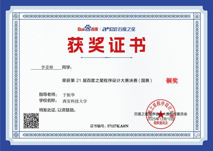 決賽當(dāng)天,李姜帥同學(xué)沉著冷靜、從容應(yīng)戰(zhàn),面對復(fù)雜的競賽題目,迅速理清解題思路,高效完成程序編寫與調(diào)試。憑借清晰的邏輯架構(gòu)、規(guī)范的代碼實現(xiàn)與合理的時間分配,最終成功躋身銅獎行列,實現(xiàn)了西安科技大學(xué)在百度之星程序設(shè)計大賽中的歷史性突破,也是學(xué)校“以賽促學(xué)、以賽促練” 人才培養(yǎng)模式的生動實踐。