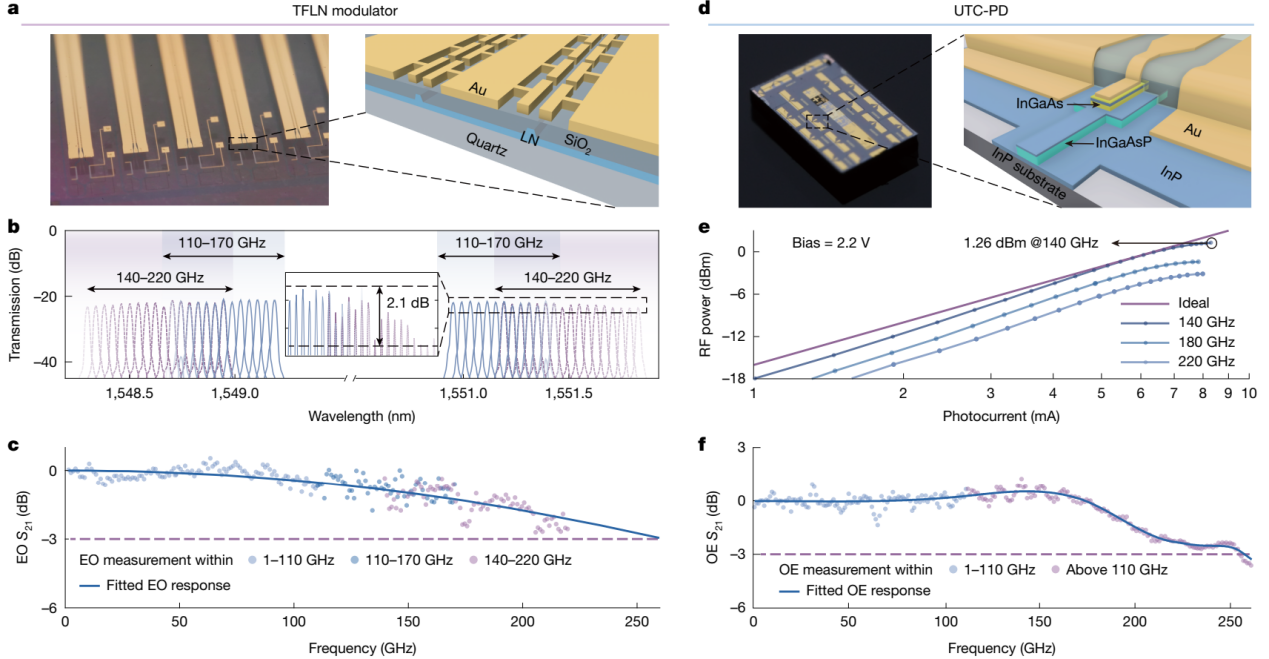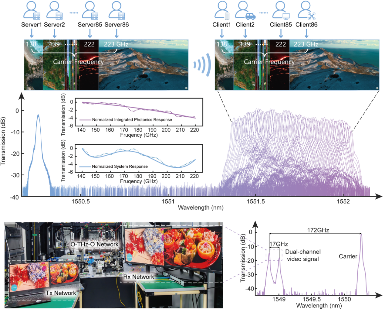 研究團隊采用集成光學方案,實現(xiàn)了250GHz以上超大帶寬的光電/電光轉(zhuǎn)換器件,薄膜鈮酸鋰調(diào)制器(TFLNMZM)和磷化銦探測器(InP UTC-PD)帶寬均創(chuàng)紀錄;谏鲜銎骷,研究團隊實現(xiàn)了光纖-無線一體化融合系統(tǒng)演示,光纖通信實現(xiàn)破紀錄的單通道256Gbaud(512Gbps)信號傳輸,太赫茲無線通信實現(xiàn)破紀錄的單通道400Gbps信號傳輸,并完成了86路8K高清實時視頻的無線傳輸演示。這一里程碑式的突破有望重塑電信通訊系統(tǒng)架構(gòu),為未來全光互聯(lián)的愿景奠定研究基礎,推動我國在該領(lǐng)域?qū)崿F(xiàn)跨越式發(fā)展。