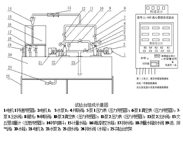 實(shí)驗(yàn)裝置由兩臺(tái)離心泵綜合試驗(yàn)臺(tái)和兩臺(tái)計(jì)算機(jī)組成。試驗(yàn)臺(tái)的組成及設(shè)備如下圖所示: