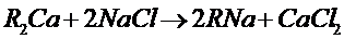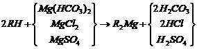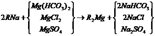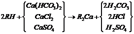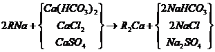 當含有鈣鹽及鎂鹽的水通過裝有陽離子交換樹脂的交換器時,水中的Ca2+及Mg2+便與樹脂中的可交換離子(Na+或H+)交換,使水中Ca2+、 Mg2+含量降低或基本上全部去除,這個過程叫做水的軟化。樹脂失效后要進行再生,即把樹脂上吸附的鈣、鎂離子置換出來,代之以新的可交換離子。鈉離子交換用食鹽(NaCl)再生、氫離子交換用鹽酸(HCl)或硫酸(H2SO4)再生;痉磻饺缦。