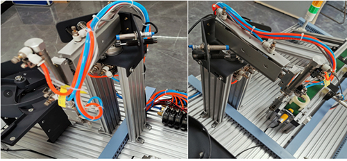 雙桿氣缸:  機械手臂伸出、縮回,由雙向電控氣閥控制。氣缸上裝有兩個磁性傳感器,檢測氣缸伸出或縮回位置(注意:紅色線接"﹢",黑色線接"-")。