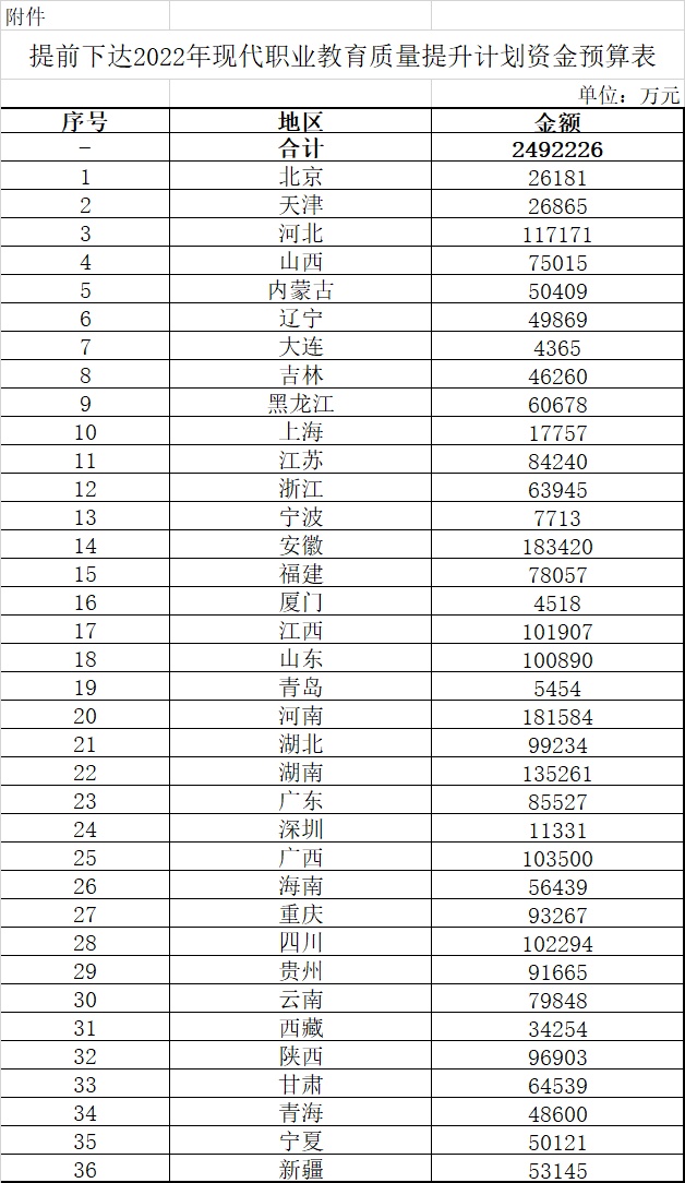 關(guān)于提前下達(dá)2022年現(xiàn)代職業(yè)教育質(zhì)量提升計劃資金預(yù)算的通知