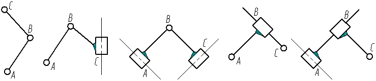 最簡(jiǎn)單的桿組為n = 2, P5 = 3,稱為Ⅱ級(jí)組,由于桿組中轉(zhuǎn)動(dòng)副和移動(dòng)副的配置不同,Ⅱ級(jí)桿組共有如下五種形式: