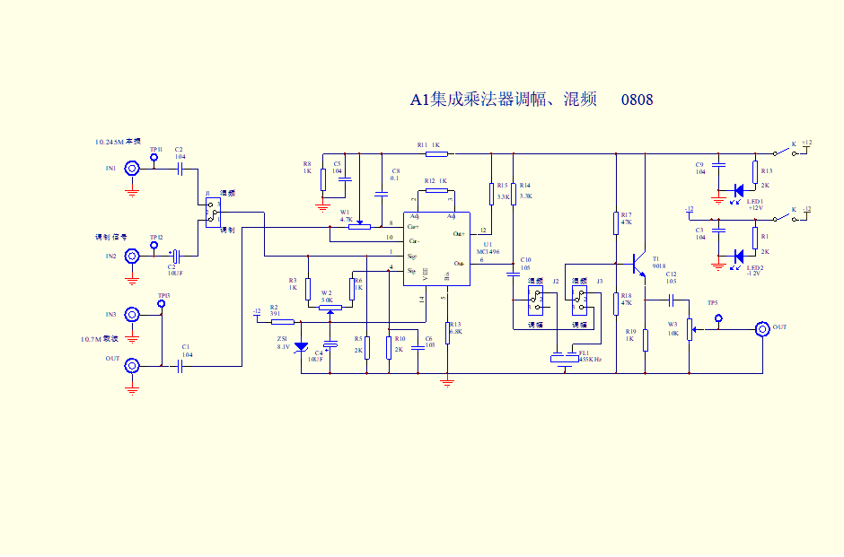 當(dāng)進(jìn)行集成乘法器混頻實(shí)驗(yàn)時(shí),把J2、J3、J5、J8、J9上的跳線塊置于1-2位置,將J1上的跳線塊改插于2-3位置,(J4、J6、J7不插跳塊);IN1、IN3分別輸入10.245 MHz與10.7MHz高頻正弦波,IN2空閑。