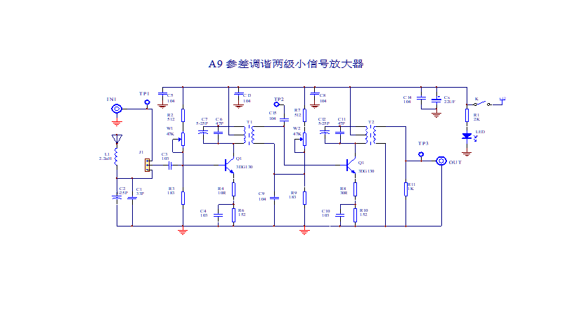 注意:當兩級放大器的中心頻率完全一致時,若各級增益過大極易產(chǎn)生高頻自激,因此,當發(fā)現(xiàn)電路有自激傾向時,可適當調(diào)整W1和W2降低工作點電流以略微降低各級增益,或?qū)杉壵{(diào)諧放大器的微調(diào)電容進行相反大小的微調(diào),預置為參差調(diào)諧模式,均可有效消除自激傾向。
