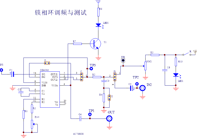 (3)   用示波器觀察VCO波形(TP1點(diǎn)),調(diào)整電位器RW1,使其自由振蕩頻率為500KHz(參考值)。