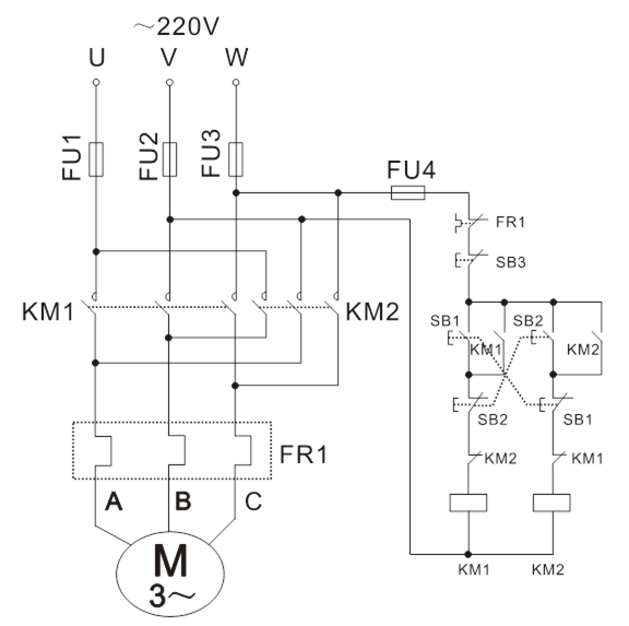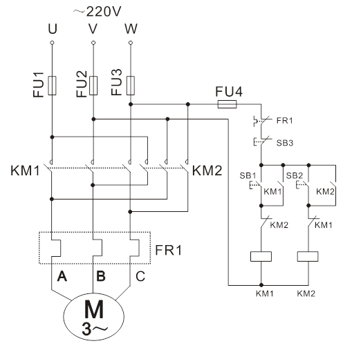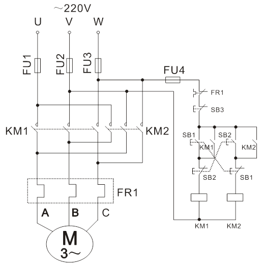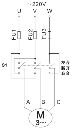 1、倒順開(kāi)關(guān)正反轉(zhuǎn)控制線路:
