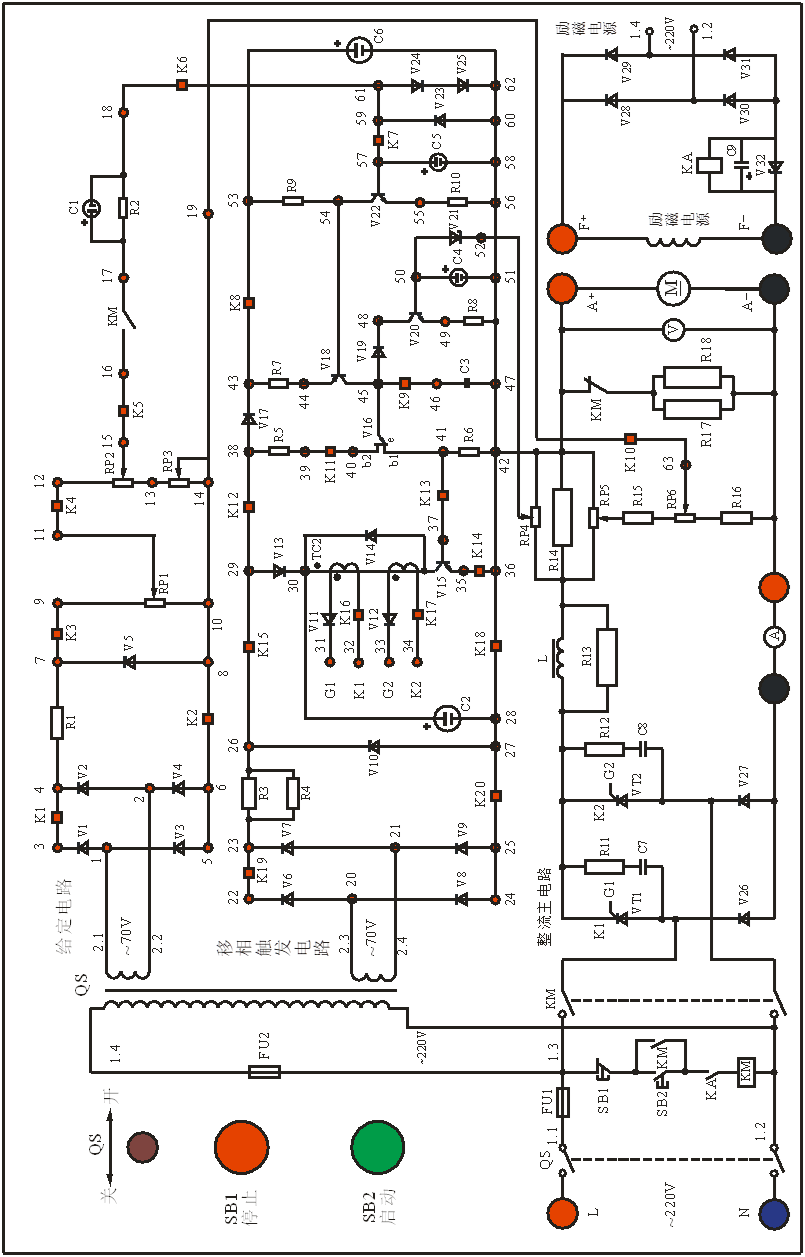 該裝置由DBSP-13小容量晶閘管直流調(diào)速電路移植而來(lái),適用于4KW以下的小容量晶閘管直流調(diào)速電路,主電路為單相橋式半控結(jié)構(gòu),系統(tǒng)采用電壓采用電壓負(fù)反饋和電流正反饋控制,并具有電流截止負(fù)反饋環(huán)節(jié)和串聯(lián)微分校正網(wǎng)絡(luò)。