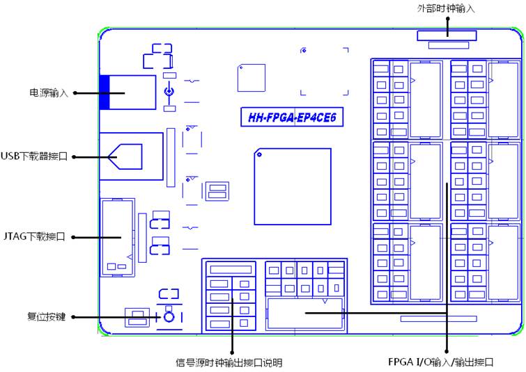HH-FPGA-EP4CE6核心板上預(yù)留有JTAG接口供用戶下載代碼。JTAG接口既可以當(dāng)做核心板FPGA的調(diào)試/編程接口,也可以用于對其配置器件進行編程。