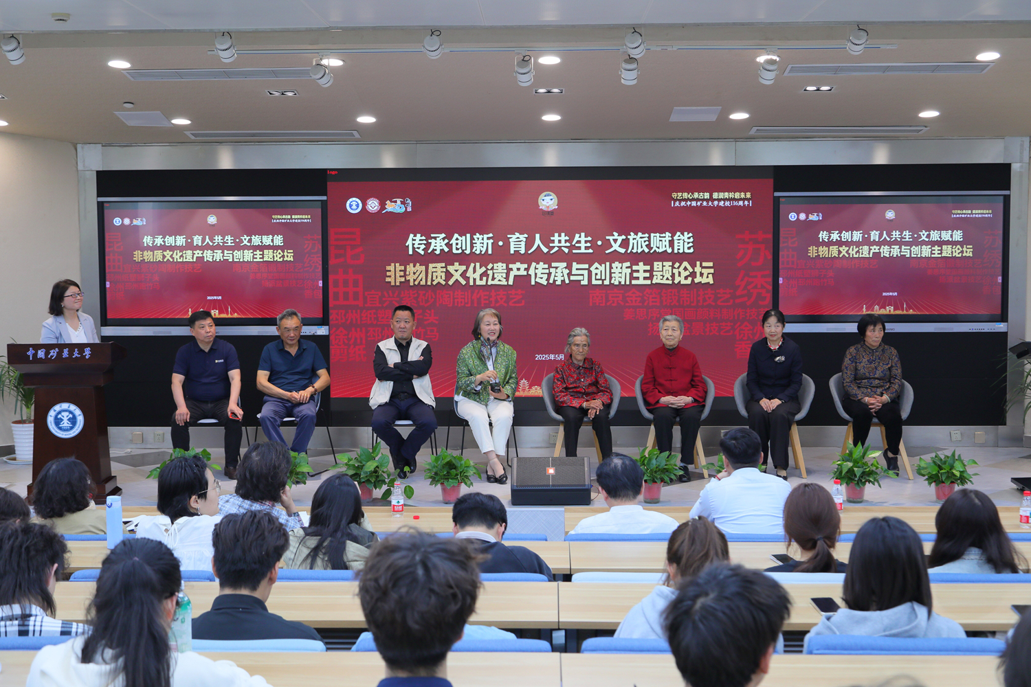 5月9日上午,在南湖校區(qū)體育館,非物質文化遺產(chǎn)現(xiàn)場展示和體驗在徐州嗩吶和邳州跑竹馬的精彩表演中拉開帷幕。宜興紫砂陶制作技藝、蘇繡、南京金箔鍛制技藝、蘇州姜思序堂(國畫顏料)制作技藝、揚派盆景技藝、徐州香包、徐州剪紙和邳州紙塑獅子頭等國家級非遺項目悉數(shù)亮相。同學們在近距離領略非遺之美的同時,還在傳承人手把手的指導下,體驗制作過程。5月9日下午,“非物質文化遺產(chǎn)傳承主題論壇”在博學大講堂舉辦。8位國家級非遺傳承人及學校專家學者齊聚一堂,圍繞“非遺傳承的當代挑戰(zhàn)與創(chuàng)新路徑”等議題展開研討。