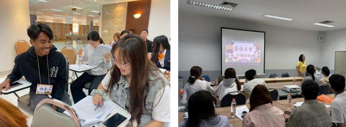 到達翁查瓦里功大學(xué)后,翁大老師首先給同學(xué)們開啟了泰語的啟蒙教學(xué)。從基礎(chǔ)會話到日常表達,老師以生動情境教學(xué)引導(dǎo)零基礎(chǔ)的同學(xué)快速融入。課堂互動中,同學(xué)們不僅掌握了實用語言技能,更通過語言載體感知泰國禮儀文化與社會風(fēng)貌,為后續(xù)文化體驗活動奠定基礎(chǔ)。