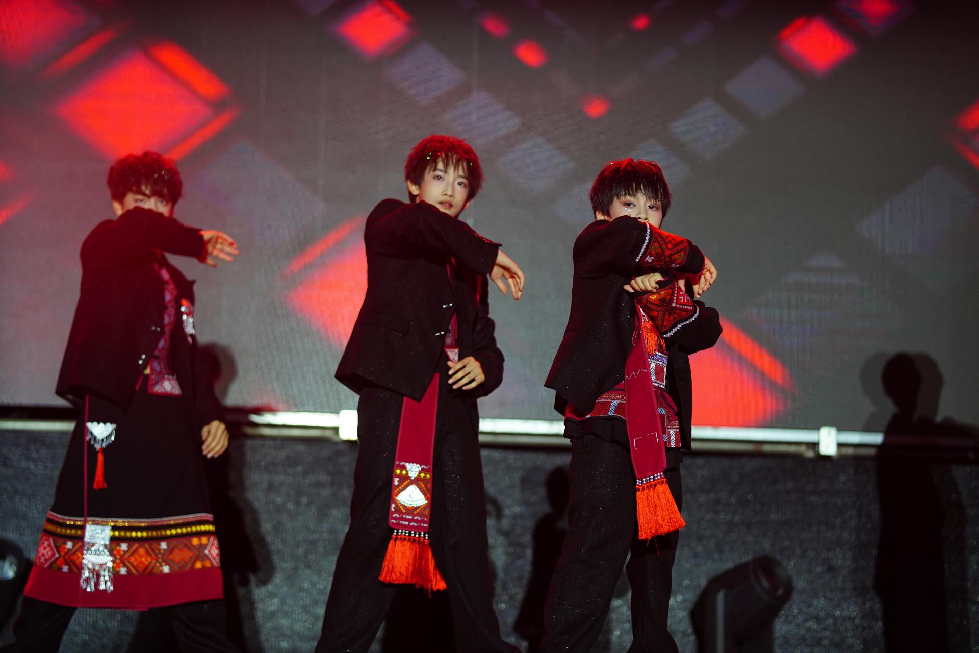 民族國潮音樂節(jié)是整場活動的高潮,三大篇章層層遞進,用音樂與舞臺藝術詮釋非遺文化的傳承脈絡。第一篇章“非遺・源” 以大型綜合歌舞劇為載體,原生態(tài)民歌的清亮旋律、壯族天琴彈唱的悠揚曲調(diào)、原生態(tài)民族舞蹈的靈動身姿,搭配身著壯錦盛裝的演員走秀——服飾上的 “萬字紋”“水波紋” 在燈光下熠熠生輝,仿佛將觀眾帶回民族文化誕生的源頭,沉浸式感受傳統(tǒng)文化的厚重。第二篇章 “非遺・承” 聚焦青春力量,南國少年團帶來量身打造的國潮表演:唱跳曲目融入壯族元素的歡快旋律,說唱歌詞講述非遺傳承的當代故事,年輕演員們充滿活力的演繹,展現(xiàn)出青少年對民族文化的創(chuàng)新理解,讓傳統(tǒng)與青春碰撞出別樣火花。第三篇章“非遺・燃” 邀請無限活力組合等廣西本土知名歌手與音樂組合登臺,他們將壯族山歌的高亢曲調(diào)與現(xiàn)代電子音樂的強烈節(jié)奏相結合,傳統(tǒng)歌詞經(jīng)潮流編曲后,既保留民族韻味,又充滿時尚感,熟悉的旋律瞬間點燃現(xiàn)場,臺下觀眾跟著節(jié)奏揮舞手臂,形成熱烈的互動氛圍。