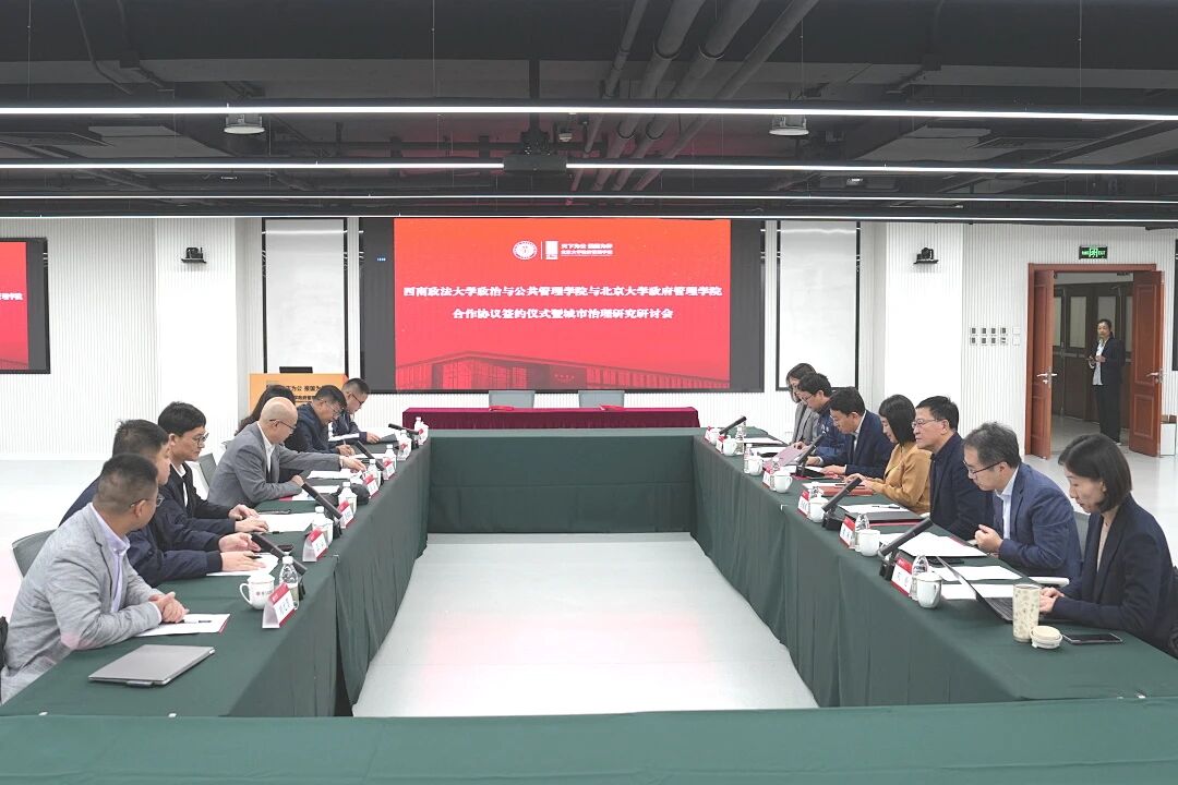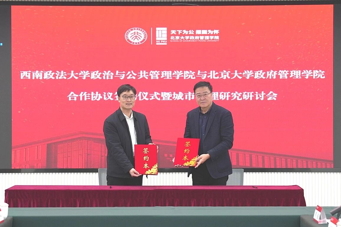10月29日,西南政法大學(xué)科研處處長張震,政治與公共管理學(xué)院黨委書記代莉平、院長曾向紅一行訪問北京大學(xué)政府管理學(xué)院。北大政府管理學(xué)院院長燕繼榮、黨委書記李楊會見西南政法大學(xué)代表團并在廖凱原樓召開座談會,雙方簽署合作協(xié)議。西南政法大學(xué)政治與公共管理學(xué)院副院長、重慶城市治理與發(fā)展研究院執(zhí)行院長類延村,副教授王山,教師李修科、劉元賀,北京大學(xué)社會科學(xué)部副部長郭琳,北大政府管理學(xué)院副院長、教務(wù)部副部長黃璜,長聘副教授孫鐵山、劉倫,助理教授羅薇參加座談會。座談會由李楊主持。