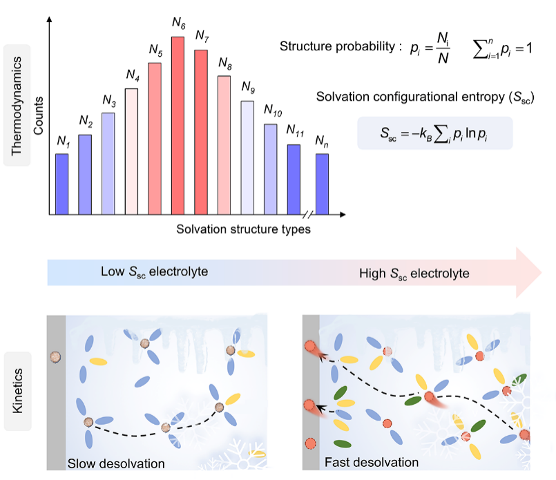 近日,湖南大學物理與微電子科學學院能量儲存團隊圍繞這一科學難題,提出“溶劑化結構熵”(Solvation-Configurational Entropy,Ssc)的概念,并系統(tǒng)揭示了Ssc對低溫電池界面反應動力學的調(diào)控機制,為發(fā)展高性能低溫電池提供了新的理論框架和設計思路。