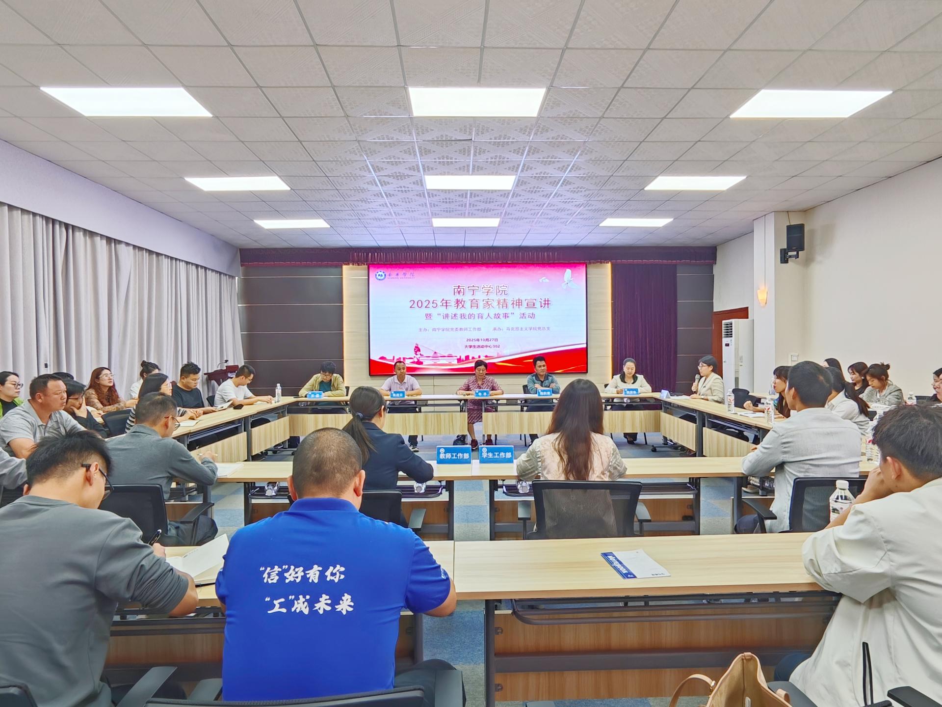 2025-11-02 09:15為深入學(xué)習(xí)貫徹總書記關(guān)于教育的重要論述,弘揚(yáng)教育家精神,加強(qiáng)新時(shí)代教師隊(duì)伍建設(shè),發(fā)揮樣板支部的戰(zhàn)斗堡壘作用,南寧學(xué)院黨委教師工作部聯(lián)合馬克思主義學(xué)院黨總支,于10月27日下午在大學(xué)生活動(dòng)中心302會(huì)議室成功舉辦南寧學(xué)院2025年教育家精神宣講暨“講述我的育人故事”活動(dòng);顒(dòng)特邀質(zhì)量評(píng)估與督導(dǎo)處韋平教授、信息工程學(xué)院陳積常教授、馬克思主義學(xué)院張連云副教授、教育學(xué)院樊原朱副教授、交通運(yùn)輸學(xué)院王磊副教授作為分享嘉賓。黨委教師工作部、學(xué)生工作部有關(guān)同志以及各二級(jí)學(xué)院專任教師、輔導(dǎo)員代表共40余人參加活動(dòng);顒(dòng)由馬克思主義學(xué)院黨總支副書記張雪嬌主持。