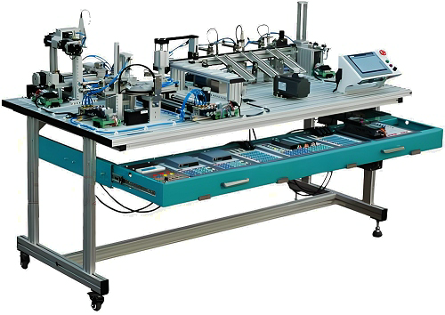 型材桌體底部基礎(chǔ)框架采用T形槽內(nèi)凹高強(qiáng)度鋁合金型材,桌體表面型材采用高幾何精度和表面光潔度強(qiáng)的鋁合金型材,并對表面進(jìn)行陽極氧化處理、外觀精美?刂破髦Ъ懿捎美浒鍞(shù)控成型、表面采用靜電噴涂處理,內(nèi)嵌高強(qiáng)度的直線導(dǎo)軌提高了支架的承載能力。電源單元配有西門子4P20A空氣開關(guān)(帶漏電保護(hù))、西門子電源(輸入:120/230V AC,輸出:24V DC/ 3A)、保險管座、電源指示燈等,可供直流24V、交流220V、380V電壓。